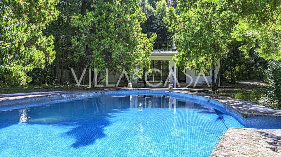 Till salu är en elegant villa från slutet av 1800-talet med eklektisk arkitektur som skickligt kombinerar kolonial, klassisk och modern stil. Belägen på en parktomt på över 4000 kvadratmeter, planterad med värdefulla växter, inkluderar fastigheten en pool och ett gästhus på cirka 100 m2.